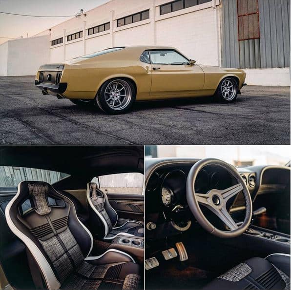 La teinte rétro kaki/beige de la carrosserie cache nombre d’éléments en fibre de carbone comme les ailes, les boucliers, le bandeau du coffre, la jupe avant ou encore le capot. Celui-ci abrite un V8 5L équipé d’un compresseur et d’une ligne d’échappement spécifique. L’habitacle mêle également classique et moderne avec des sièges baquets partiellement recouverts d’un tissu rétro et une planche de bord habillée de cuir brun. Selon SpeedKore, Robert Downey Jr. s’est beaucoup impliqué dans la conception de cette Mustang personnalisée.