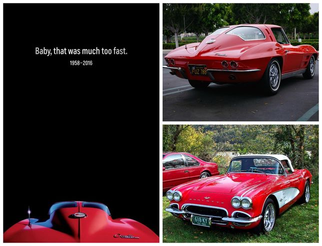 La publicité de Chevrolet en hommage à Prince (à gauche) et la Corvette en version Stingray (en haut à droite) et roadster. Chevrolet. Stephen Hennessey. Don O’Brien